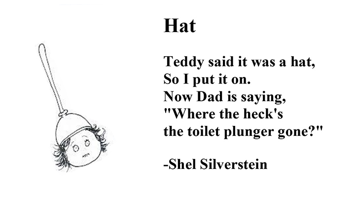 Laughter: Our family right now is enjoying a good dose of laughter at the dinner table reading poems by Shel Silverstein. I mentioned him yesterday. Here is another favorite about the plunger hat!